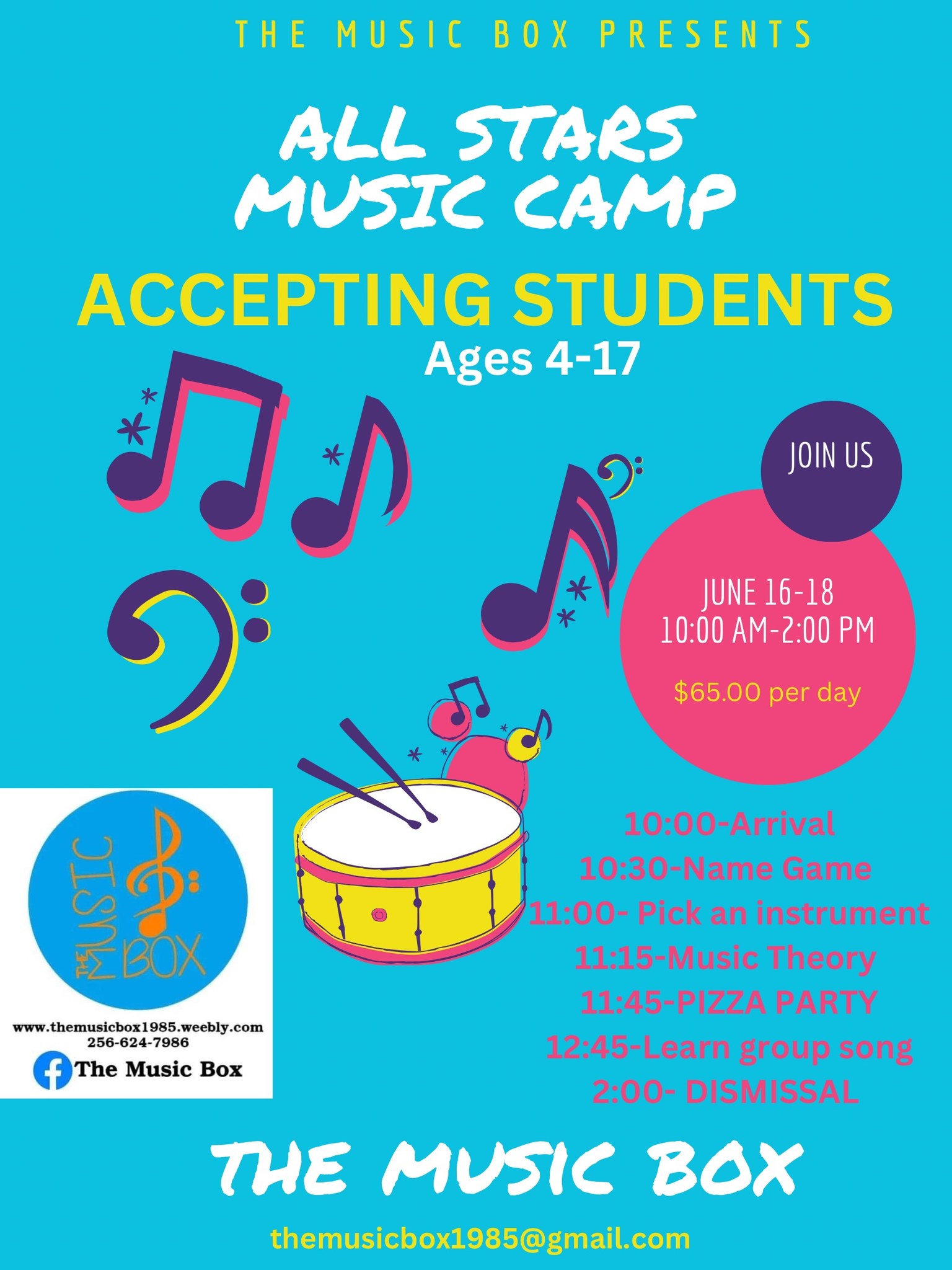 Not your AVERAGE music camp!!!! This is the camp for all levels ( beginner, intermediate, and advanced)!! This is the camp where you do not have to have any prior musical knowledge!!! This camp is INCLUSIVE!! All instruments, including VOICE are welcome!!!