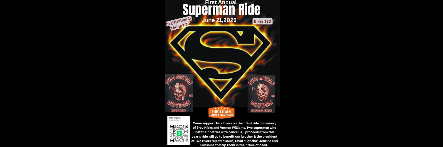 Come support Two Rivers on their first ride in memory of Troy Hicks and Vernon Williams, Two supermen who lost their battles with cancer. All proceeds from this year’s ride will go to benefit our brother & the president of Two rivers rejected souls, Chad “Poncho” Jenkins and Sunshine to help them in their time of need.
