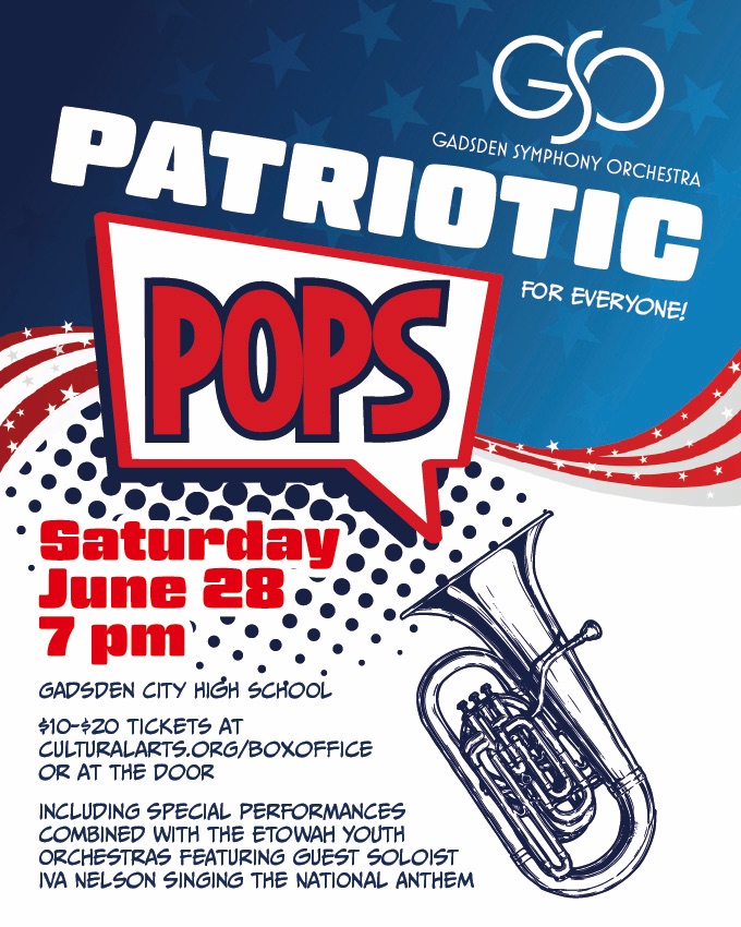 Join the Gadsden Symphony Orchestra for an evening of Patriotic Pops on Saturday, June 28 at 7 pm at Gadsden City High School. The concert features American composers such as Morton Gould, Aaron Copland, George Gershwin, Irving Berlin, John Phillip Sousa, James Horner and Leonard Bernstein. GSO will be joined by the Etowah Youth Orchestras for several selections. Guest soloist Iva Nelson will sing the National Anthem. This will be a fun evening for all ages!